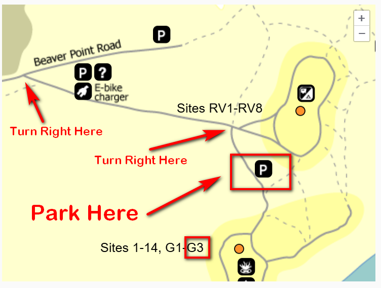 - DO NOT continue straight to the area for RVs. These sites will be marked RV1 through RV8. This is not where we are camping.
