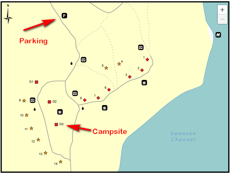 - Park in the parking lot designated for walk-ins. You will see wheel barrows there which you can use to load your gear. You will then need to follow the signs to walk to campsite G3